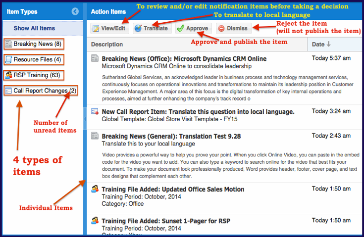 Functioning of ‘Translate’, ‘Approve’ and ‘Dismiss’ buttons are similar to ‘Breaking News’ and ‘Resource File’ and ‘RSP Training’ action items.