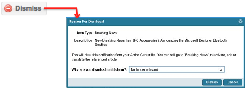 When clicking Dismiss button for a notification you will now see a pop-up asking you for a reason why you are dismissing the task, file or Breaking News item. Please enter a brief reason why. (Examples: “Product not available in our country” or “Wording was too long.”)