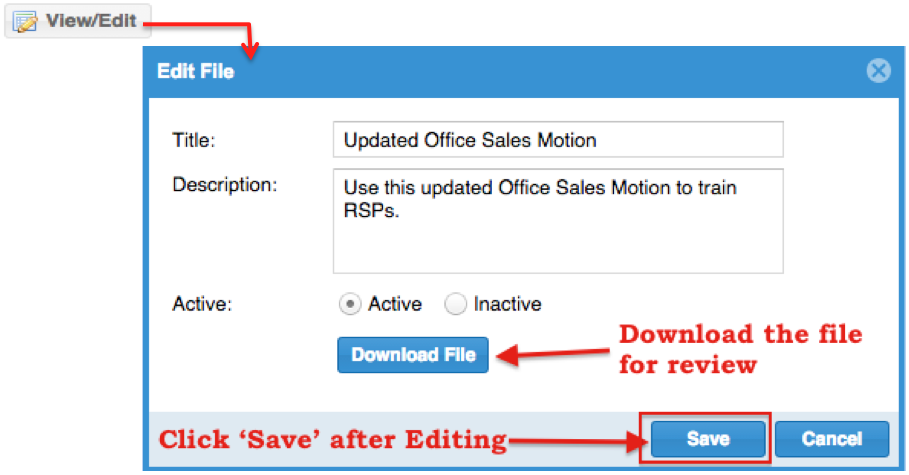 These types of action items are sent typically when new RSP tasks are added or RSP training related files (resources) are added. Separate action items are sent for training tasks and training files. Each displays a little differently in the Action Items list, but the options for each (except View/Edit) are the same as above. Details of RSP Tasks are shown in the action item description itself. Since there is nothing more to show about RSP Tasks, their action items do not have ‘View / Edit’ buttons. RSP Training action items, on the other hand, have ‘View / Edit’ button enabled. Clicking on the ‘View / Edit’ button of this type of notification item will popup a window like below, where user can edit the attributes of the file, download the file and review its content.