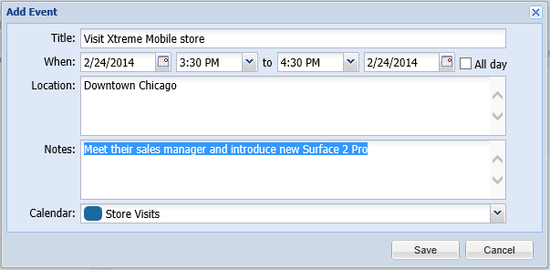 Users can drag and drop the stores from the left pane to a date on the calendar pane. That schedules a store visit. All stores drop into the calendar with a default time. You can click on the scheduled visit record now in the calendar and set whatever time and other details you wish to visit the store (as shown below).