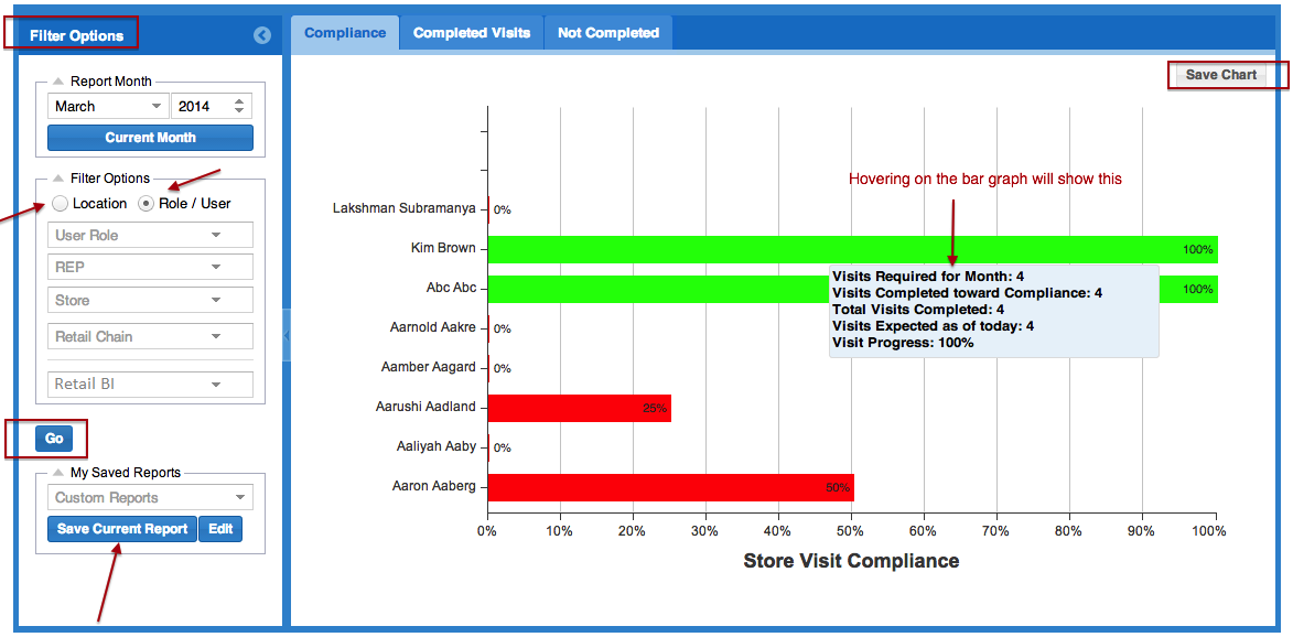 If a representative has done more store visits than required to meet his/her compliance level, the percentage figure will be shown as 100+%. For incomplete current months, all figures are prorated (calculated for the portion of the month completed). That is, if the frequency of store visit is set to 8 per month for a user and if we're only halfway through the month, the number of visits expected up to that point in the month would be taken as 4. If the rep is ahead of schedule and has already completed 5 visits to that store, then the report would show 100+%. However, the system does not allow the number of visits completed figure to ever be higher than the full frequency number for the month, which in this example would be 8.
