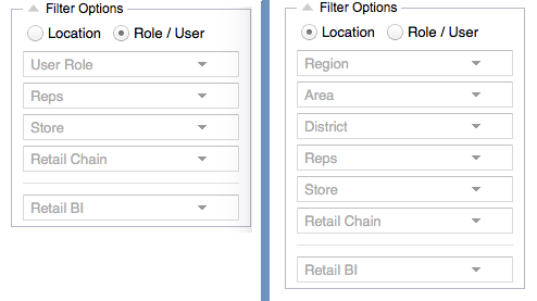 Location based filter options allow sub filters based on regions and sub regions as designed in store management page. User Role based filters allow sub filters based on various user roles defined in user management page. For a selected user role, you can further filter down on individual user names and the stores assigned to the user. Both user role based and location based filter options allow Retail Chain and Retail BI sub filters to focus the results on the line of business.