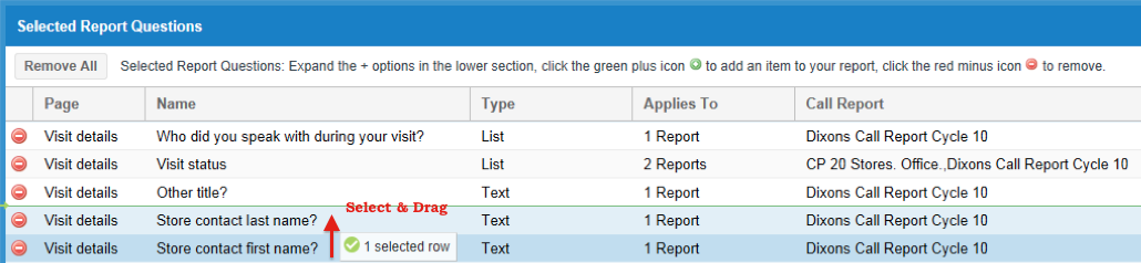 To add / select a question / field in to the upper panel, Click on the plus button  corresponding to the question in the lower panel. You can also drag and drop the questions. As you add / select a question / field, it disappears from the bottom pane.