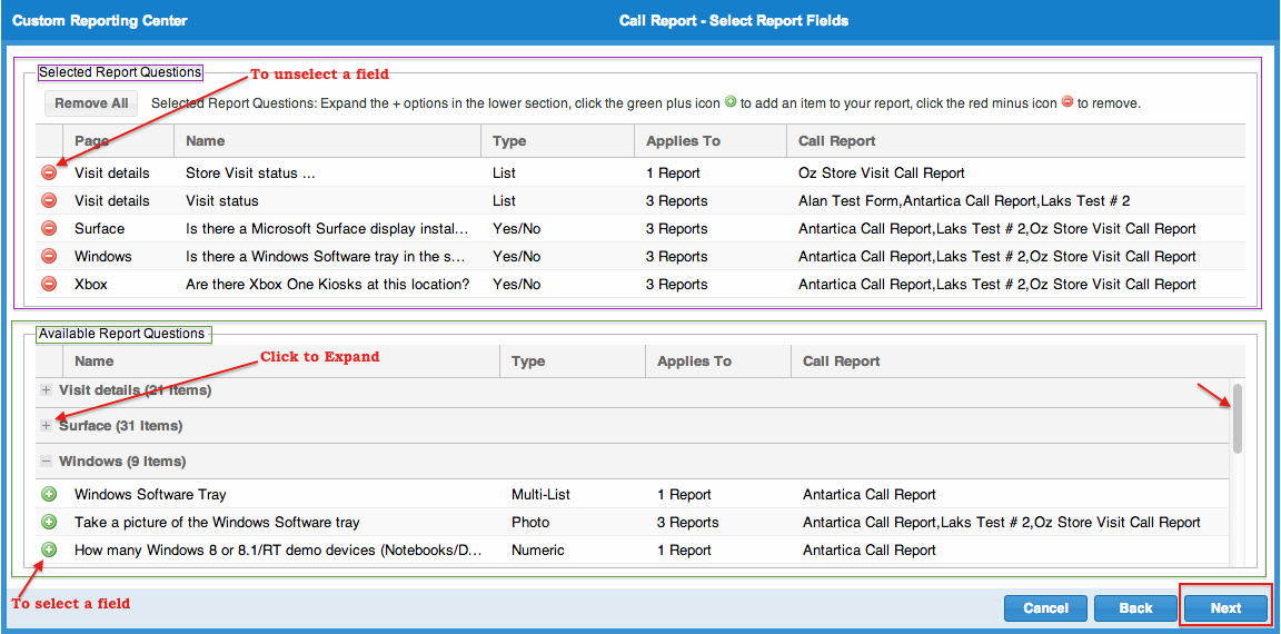 On this page, you will see two horizontally arranged panels. The top panel shows the list of selected fields / questions (in the order of appearance) and the bottom panel shows the list of all available questions / fields for selection (from the call reports you selected in previous step). You will be able to see all the fields / questions available in the call reports you selected in the previous page. All fields are grouped based on products / sections. The collapse / hide button will help you expand / minimise the list. 'Type' refers to the response type of the field / question. 'Applies To' gives the count of how many reports from your selection in previous page contains that particular field.