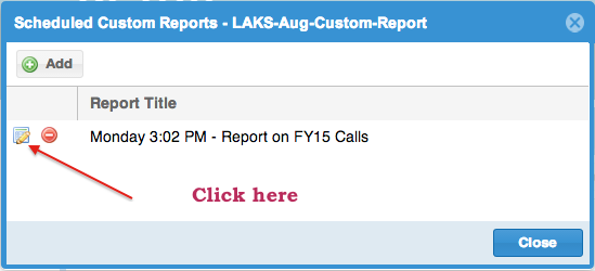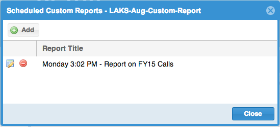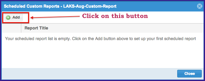 A popup window (like below) will appear. Click on the "Add" button. If there are no previously scheduled reports, this page will be empty. Otherwise, the scheduled tasks will be listed here.