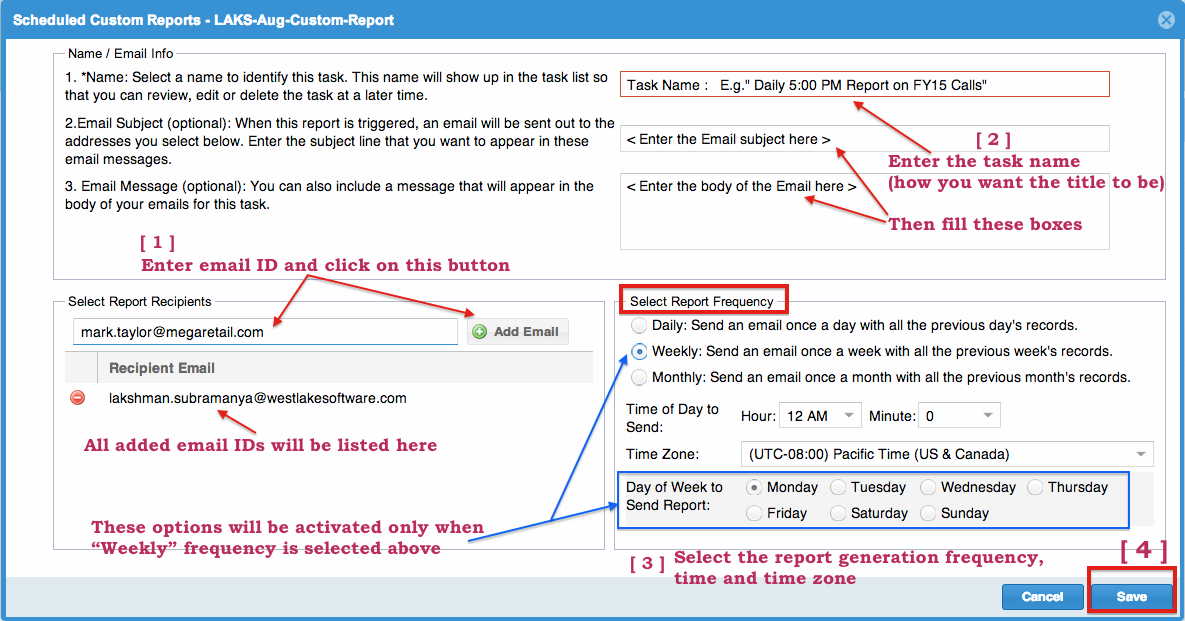 Enter the email addresses, task name and report generation frequency and "Save".