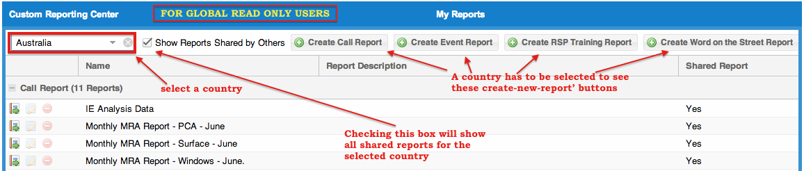 To view reports saved and shared by others in your country, tick the check box 'Show Shared Reports' (refer to the picture below). You will not be able to remove or edit reports shared by others.