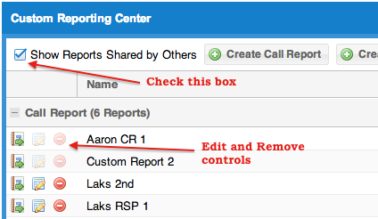 You can also edit an already saved report and share it at a later point in time. For that, go to the main page of custom reporting center, click on the 'Edit' button of the relevant saved report. This will open a small pop up window like shown below, where you can check the 'Share Report' check box and Save. To un-share a report, un-check this box and save.