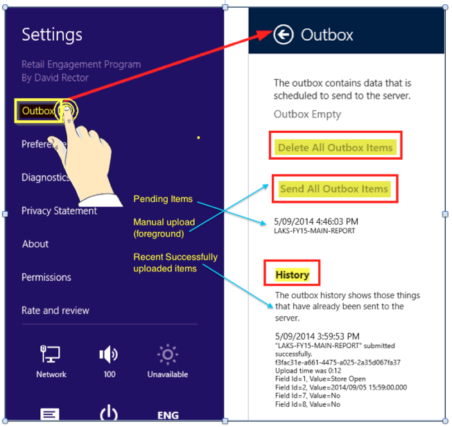 The Outbox of REP Windows Client App can viewed through ‘Charms Bar’ >> ‘Settings’. Outbox is an intermediate place where all submitted forms / records are stored before they are processed further and uploaded to the server.
