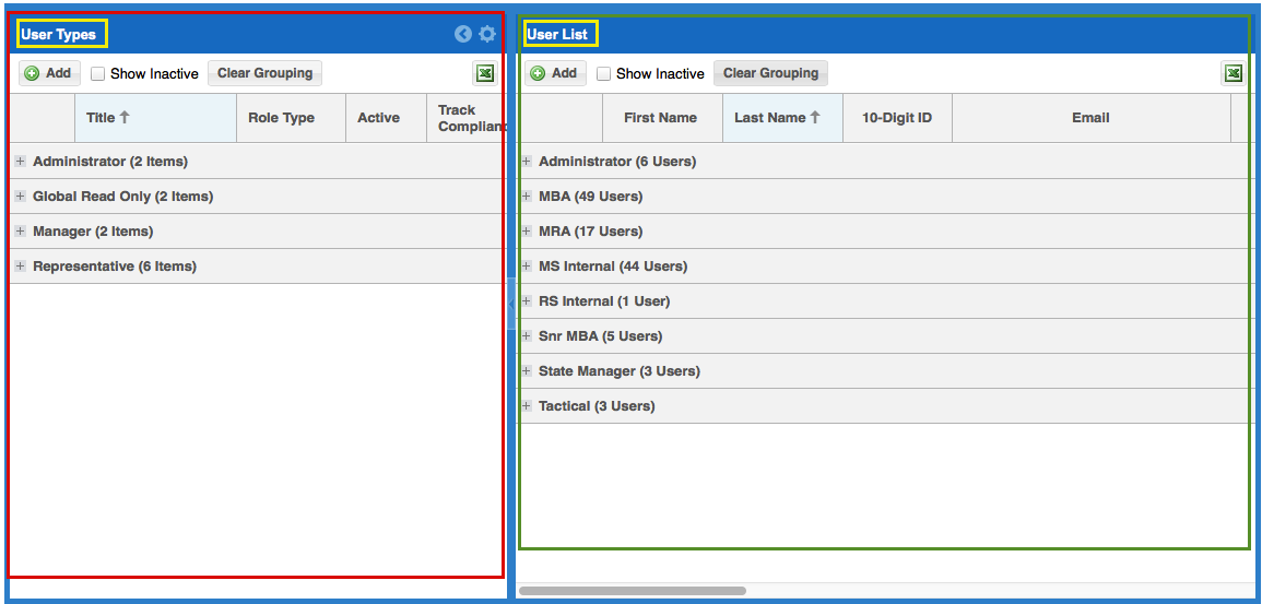 The panel on left side is for listing and managing User Types (also known as User Levels). Right side panel is for listing, adding and managing Users (persons).
