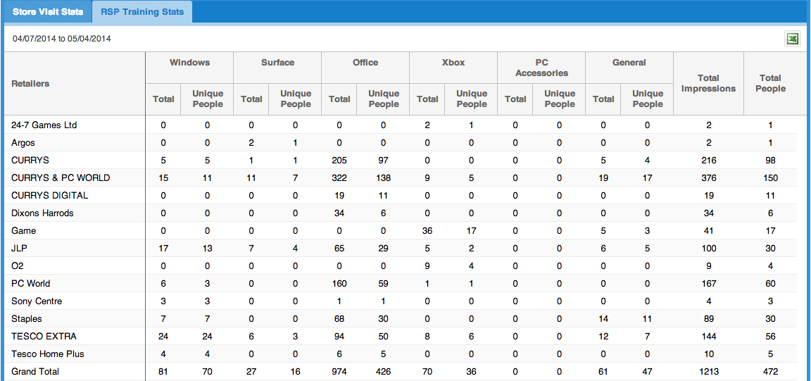 This report shows data collected through RSP Training forms. Each record gives store wise split. Grand total for the month is the bottom most record.