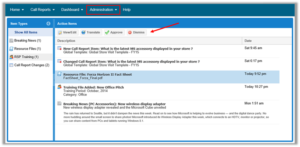 Welcome to a new, time-saving feature in the REP Administration menu which allows country Administrators to view a list of pending notifications, and immediately take action. Notifications are sent to country Admins based on data that is created or changed by the REP Global account (Microsoft Corporate). Admins will be able to efficiently review any new items (Breaking News, Resource Files, RSP Training, Call Report fields) and make changes and/or translations prior to the items becoming visible to their users. In some cases, the admin may have the option to reject an item.