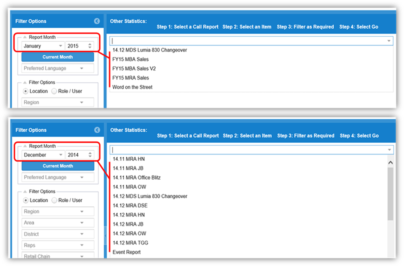 Found at Dashboards >> Misc., this handy report tool can quickly generate data on single questions. The available call report list is now dynamic according to what month is selected to the left. After you select the month and year, the drop down list includes all reports that were active and had submissions for that period. Previously the list only included active call reports.