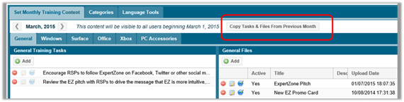 Admins will find this under Administration > RSP Training Management > RSP Tasks and Files. Use the button to simply copy global and local tasks and files to an upcoming month. Then use the Remove Topic button to delete any unwanted tasks or files to adjust the list.