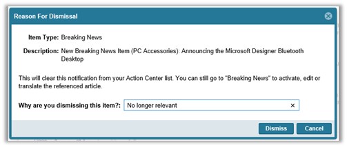 This change is found in Administration > Action Center. When clicking Dismiss button for a notification you will now see a pop-up asking you for a reason why you are dismissing the task, file or Breaking News item. Please enter a brief reason why. (Examples: “Product not available in our country” or “Wording was too long.”) This data will be collected to help the training team produce better content.