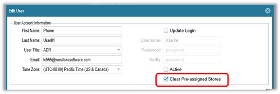 Here is a new way for Admins to un-assign stores from an inactive user. Use the checkbox added to the Edit user window, and the Save. Secondly, in the User Store Assignment module, inactive Reps will now be listed and denoted with an Inactive label after the name.