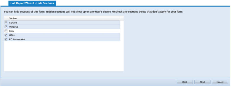 In this page, you can select or un-select various sections in the template report you have chosen. If you have chosen the Global Call Report as template, it has sections based on different product categories (e.g. Surface, Windows, Xbox etc.). There is a standard set of tasks for each category. You will be able to edit or remove some of those tasks, but some others are mandatory since they map to global KPIs and cannot be removed.