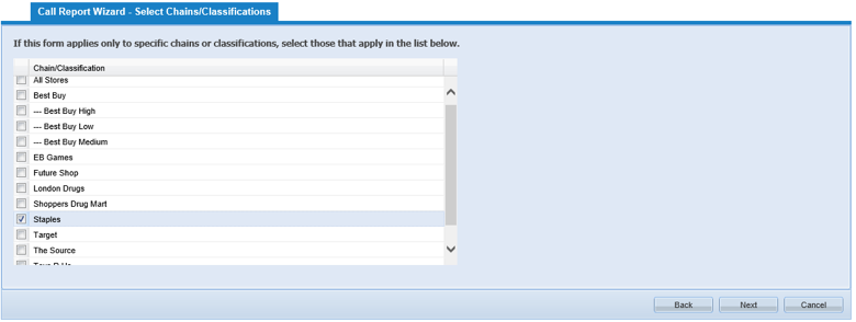 Classifications are used in a Store to define different support levels for a store chain. Following the Field Labor Guidance, the classifications would be Good, Better, Best. You can define your own classifications based on the support you provide to the retailer. See the Store Management section of this guide for information and setup of store classifications. You can choose one or many or all store chains or classifications. The call report will be made available to those store chains selected.
