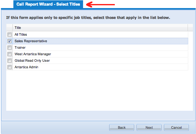 Select the Rep Titles that you want to have access to this call report and click the Next button.