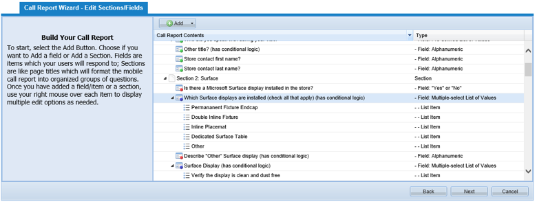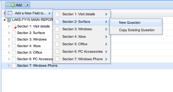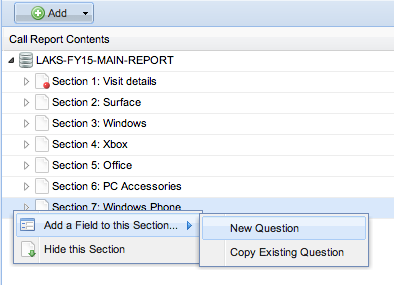 To add a new task or question (field) click on the "Add" button on the top of the Call Report Wizard and select the section that you want to add a field. New fields show up at the bottom of that section but can be moved by dragging and dropping them into the correct location.