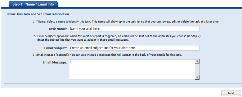 Enter the "Task Name", "Email Subject", and the "Email Message" for this escalation. Click the "Next" button to continue.